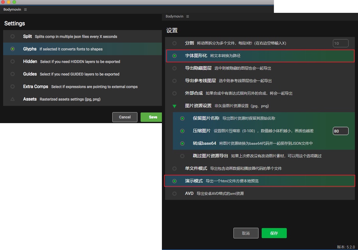 每次导出时都需要进行设置。标红区域为必选选项。字体图形化可以将字体转化为路径,不勾选会因为应用的平台没有相应字体导致文字加载出错;勾选演示模式后会生成 html 文件,打开该文件即可预览动效。