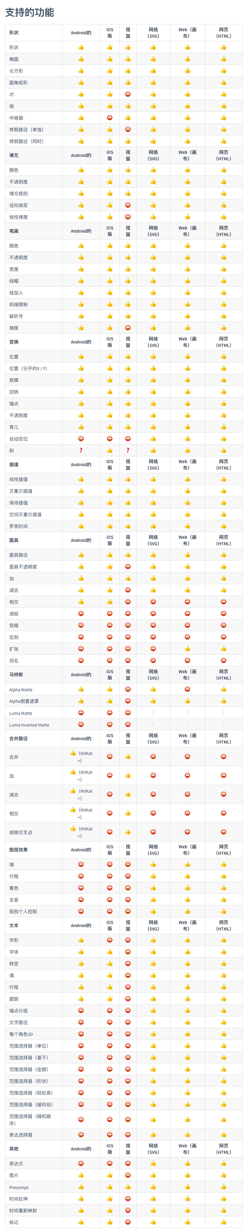 上图为 Lottie 支持的主要 AE 属性,此处有删减掉部分不常用的属性。可以打开以下链接查看完整版http://airbnb.io/lottie/#/supported-features