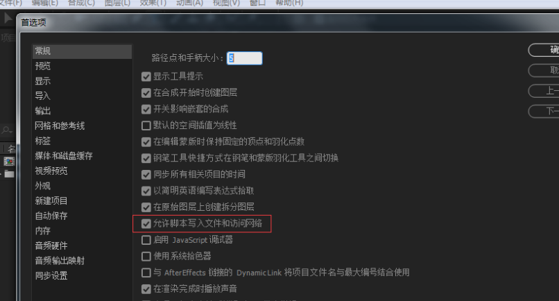Mac:转到Adobe After Effects>首选项>常规>并选中「允许脚本写入文件和访问网络」。