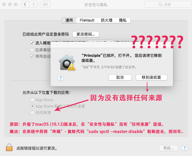 原因:升级了macOS (10.12)版本后,在“安全性与隐私”没有“任何来源”选项。