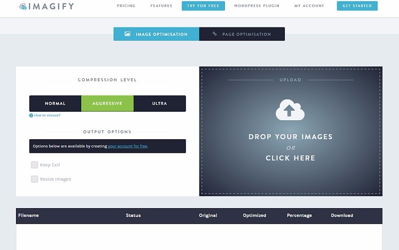 打开 Imagify 网站,选择上方的「TRY FOR FREE」功能,会看到如下画面,简单介绍一下如何使用,很简单,只要在左侧选择你要的压缩模式、输出设置(必须注册),然后把图片拖曳到右边框内,就能开始压缩。