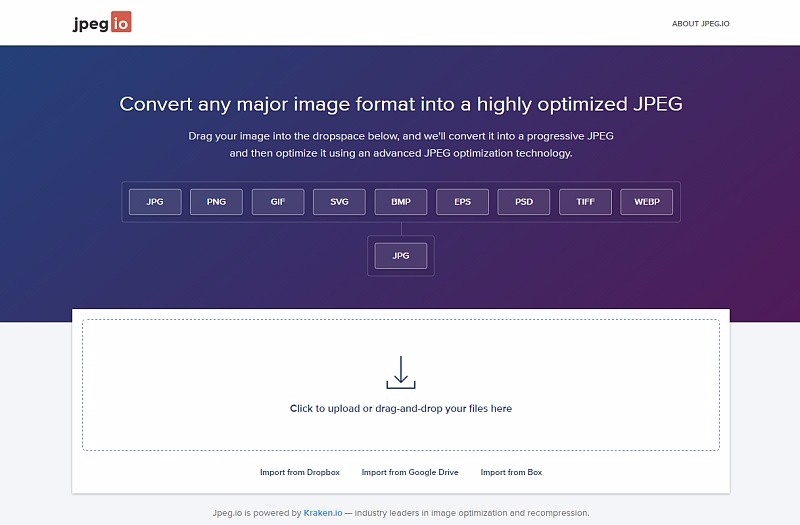 打开 Jpeg.io 网站后,直接把要压缩或转换的文件拖曳进来,或点选下方链结快速从你的云端硬盘批次汇入图片。目前没有限次单次压缩文件的图片数量和大哥文件大小限制,支持图片格式也相当丰富,几乎任何图片都能透过 Jpeg.io 来进行压缩处理。
