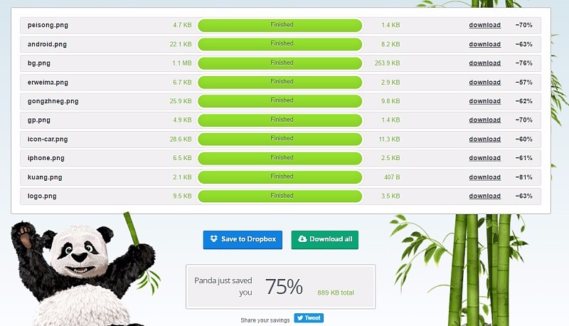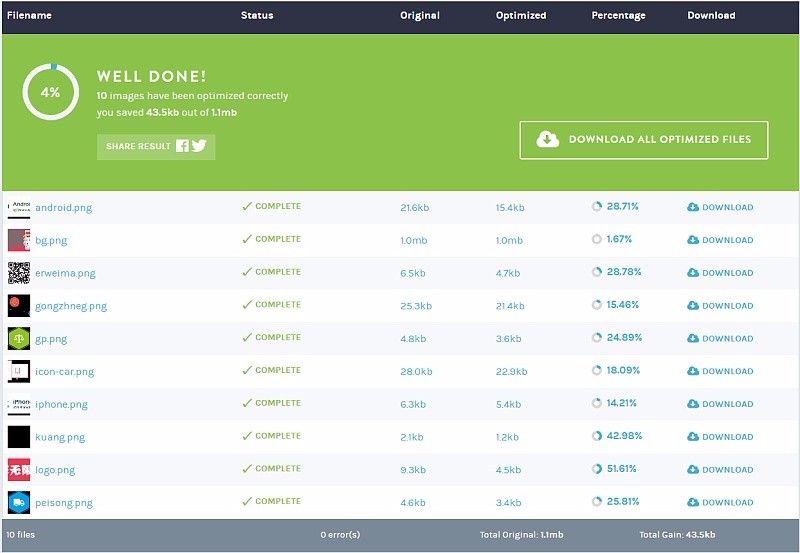 点选图片最后面的「Download」或者点击绿色区域内的「Download All Optimized Files」将所有图片打包下载。