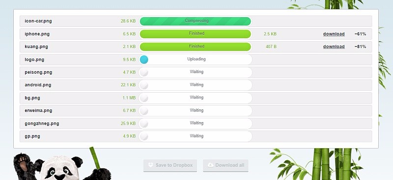 当上传的所有图片,压缩进度100%,转态为绿色时,压缩已经成功。(当压缩出错会变为红色,且提示错误)