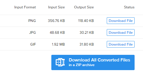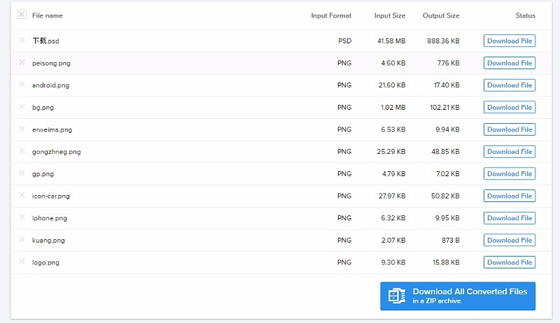 将鼠标光标移动到下载链接上方,还会出现图片预览,不过这么小张好像也无法看到什么,如果图片较多,可直接点选右下角「Download All Converted Files」将所有文件打包成Zip文件全部下载。(U妹曾一次性压缩过136张图片,和41.5M PSD源文件,确实很给力)