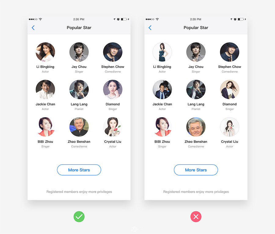 在人物展示的设计中,如果并列出现多个人物形象,为了保持视觉平衡我们需要调整并列图片的大小比例,就像所有角色都是在相同焦距下拍摄的。在人物上下位置的调整上面我们要尽量控制视平线的方向,让他们的眼睛处于相同的位置左右。