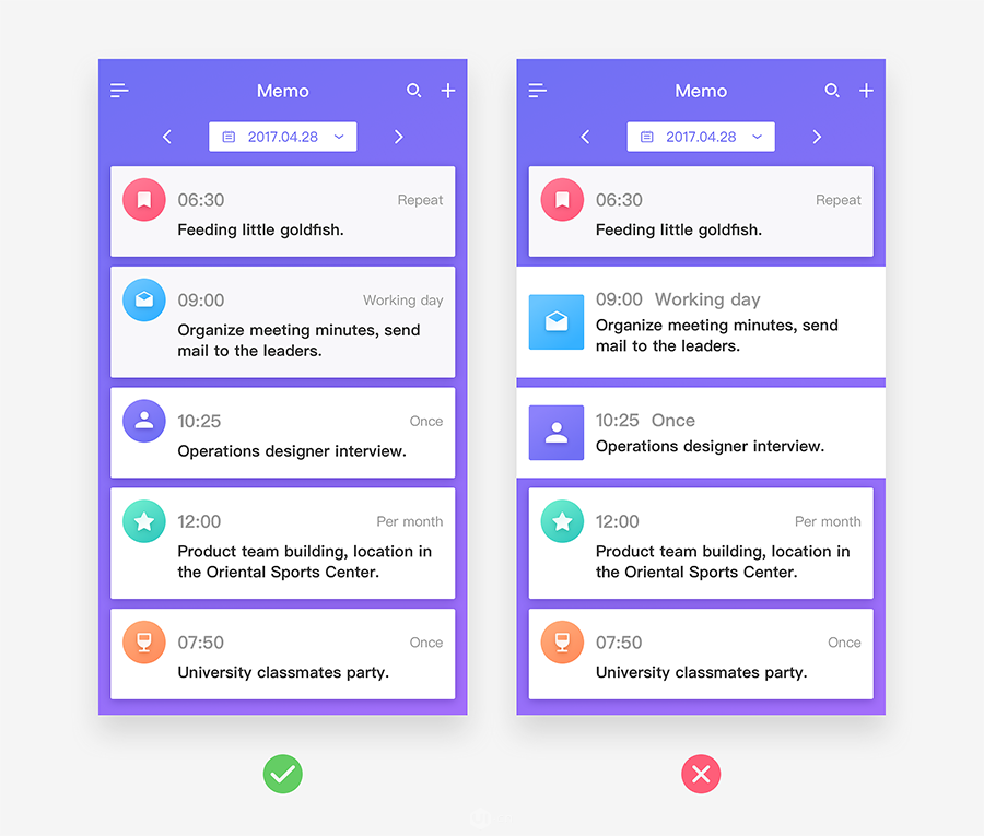 相同的信息模块采用统一的设计表达,不要为了变化而加强用户的理解。前后信息设计的多样性也许在视觉上面更加丰富,可是用户会理解为这是两个不同的模块,操作会不会也不同,无形中就增加了用户的思考时间和学习成本。