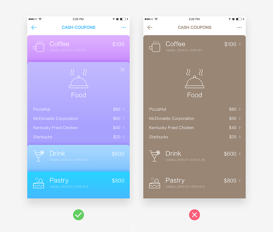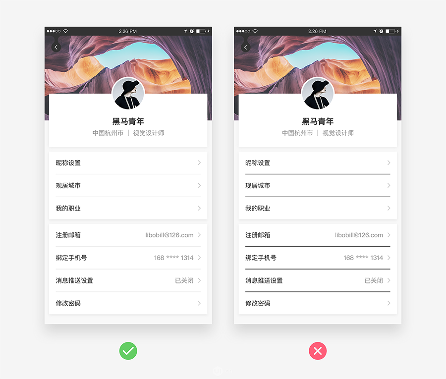 界面设计中往往细节的处理最容易被忽略,根据界面配色的不同,我们在分割线色彩的选择上面也要做出相应的调整。由于分割线的作用是区分上下信息层级和界面装饰,配色的表现力要低于文字信息的力度,通常我们会选择浅色而否定深色,这样界面会更加简洁通透。深色的分割线要慎用,除非在一些特定的产品场景下。