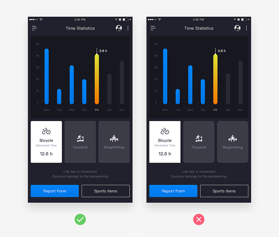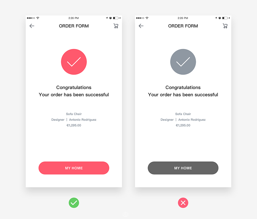 按钮的设计必须要清晰准确的传达出当前状态,不能为了视觉效果而带给用户错误的判断,例如深灰色的按钮用户会理解为是禁用状态而放弃点击。