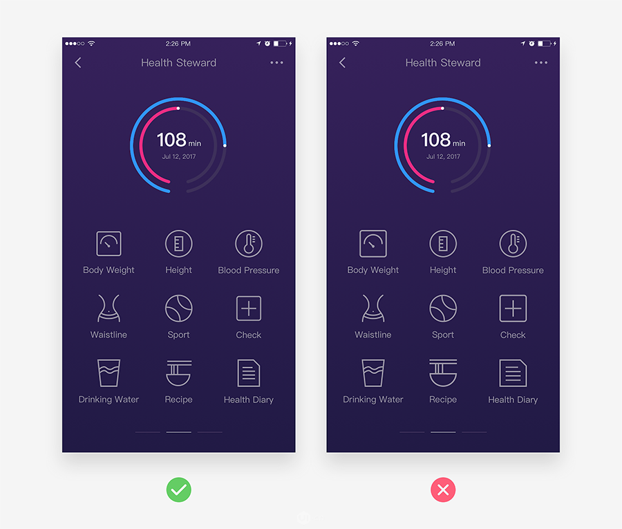图标在配色上面也要保持有规律的统一,采用相同颜色是比较常用的配色方式。如果你采用不同色相的配色方式,要保持整体的配色协调,不要出现饱和度、明度反差过大的配色而影响整体的视觉协调。