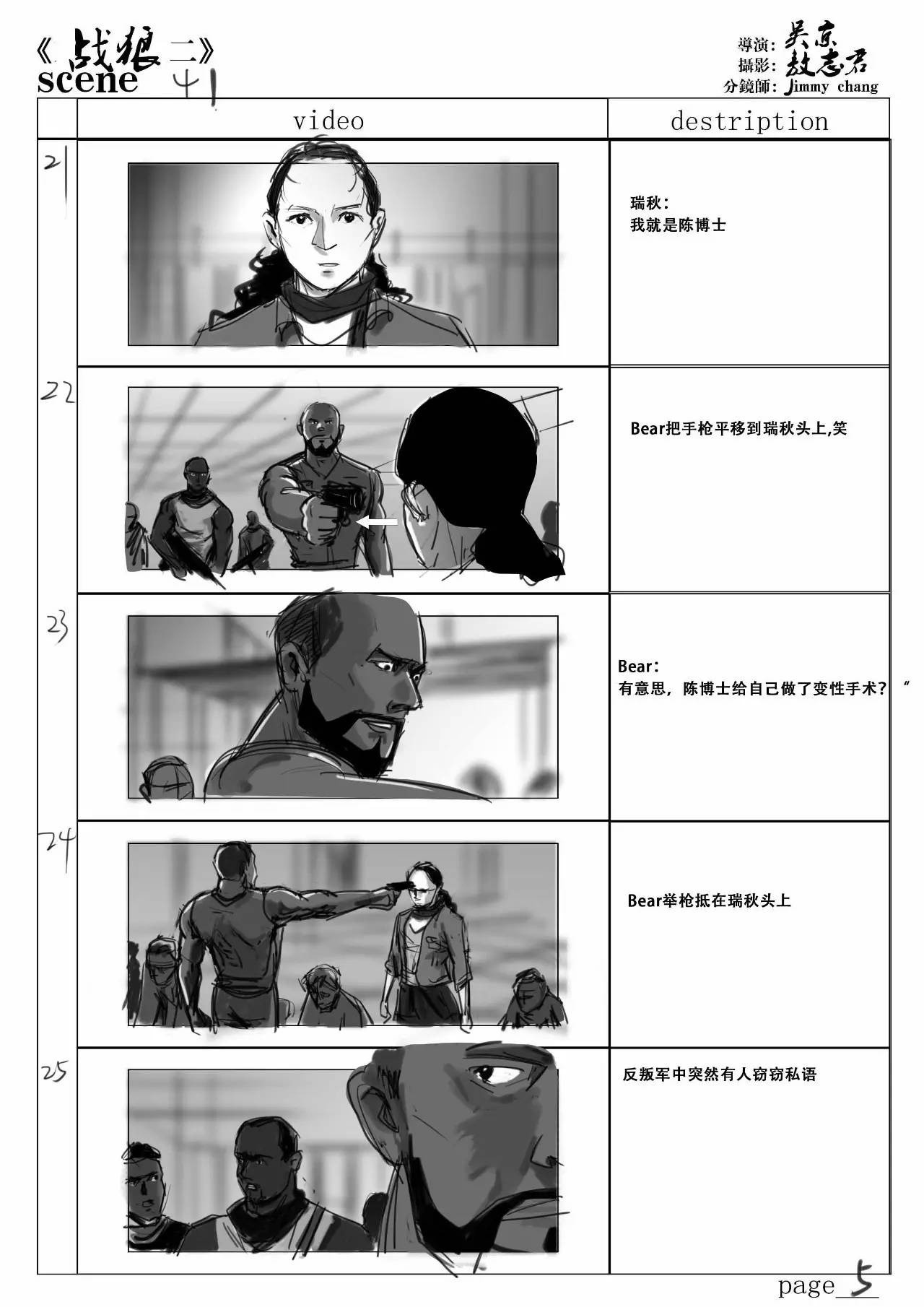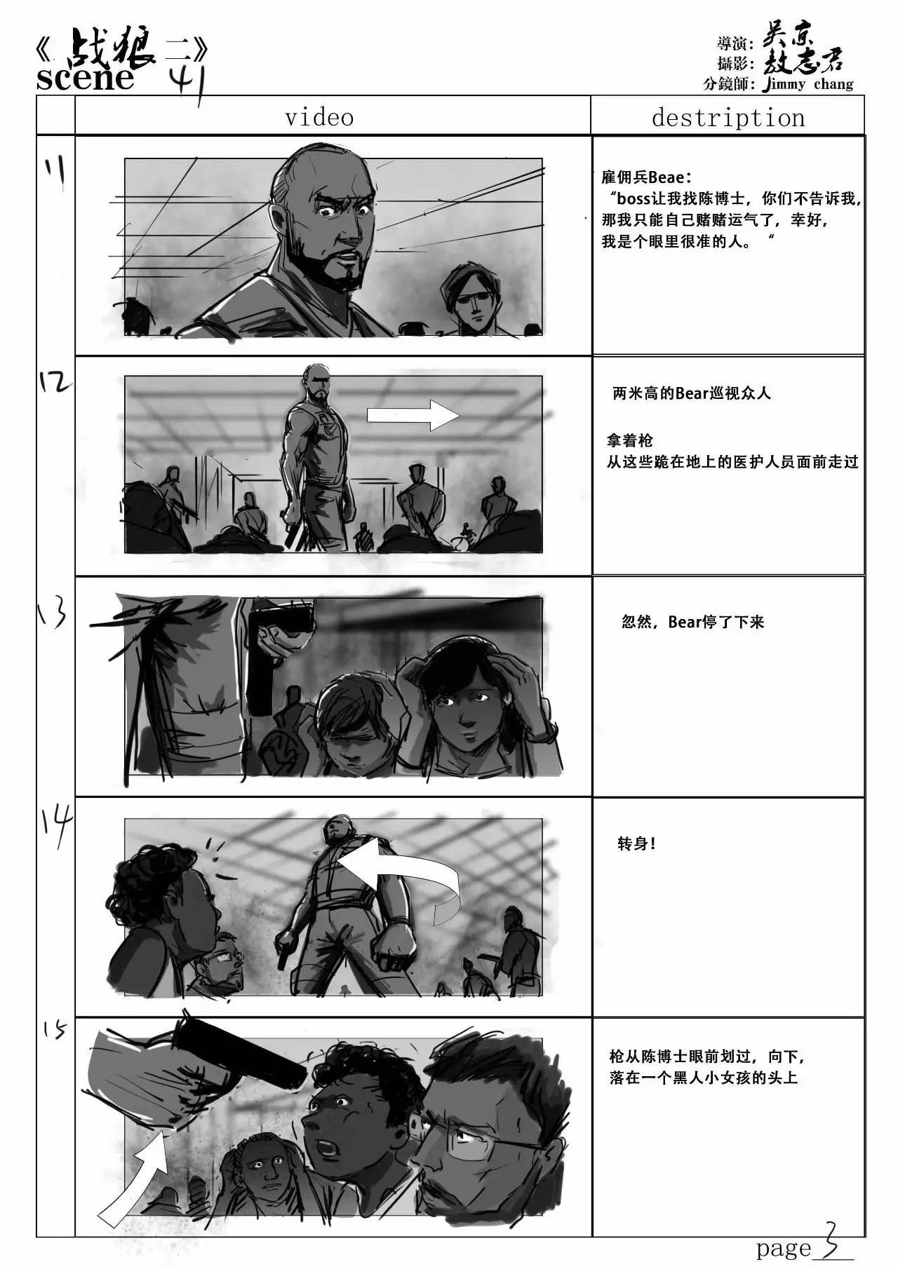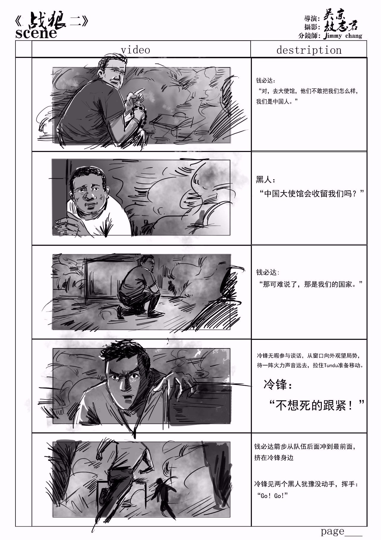 那一场的视觉冲击力在于场面的极度混乱,政府军与反政府军的交火,死伤的非洲贫民,还有反政府军的极度残忍…..纵使冷锋这样的英雄都无法平息这样的战火,更多的情感是英雄面对乱世的无奈。冷峰纵使有万般能耐,也只是一名身手矫健的中国军人。很遗憾,我觉得我在故事板上没有体现出来这种感觉。虽然画出了枪林弹雨的感觉,但是就真正意义上的导演思维创作还远远不够。
