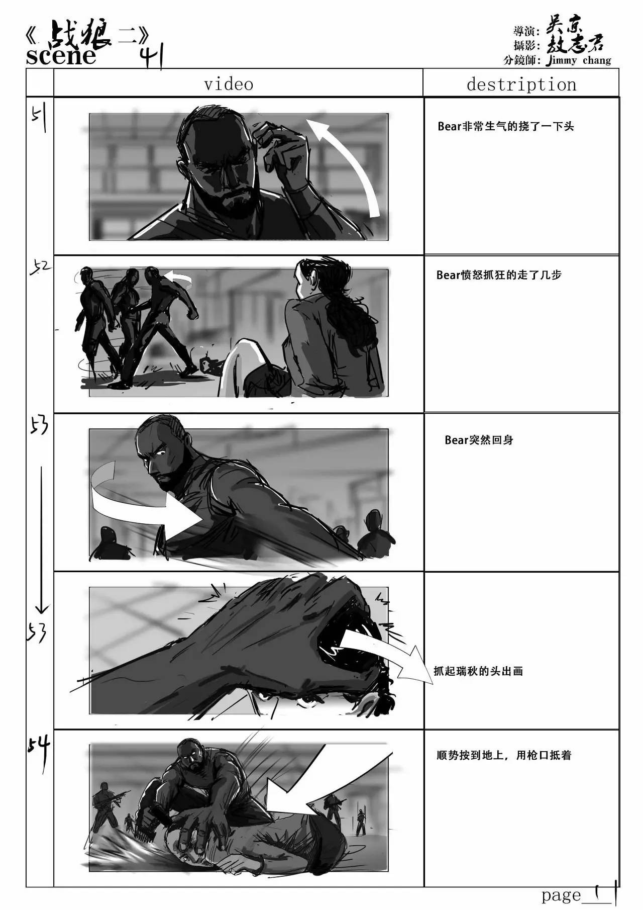 所以《战狼2》的分镜头,但从单个画面塑造方式,绘画层面,造型层面,以及用线概括形体的方式这些画功上的表现,京哥的认知未必到位,毕竟这点需要同样是画画的同行才看的出绘画功力的好坏与否;但多个镜头连续看下来,在脑海中形成一套分镜图剪辑片段,而这些片段的每个镜头的剪辑时长,试着根据故事板画师绘制的镜头去试着在思想中剪辑,就这点来说,京哥是绝对有导演思维的。
