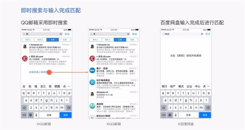例如,QQ邮箱预先已下载部分数据到本地,搜索可即时看到结果(仅包含已下载的数据),点击「在服务器上继续搜索」,才向服务器请求数据。