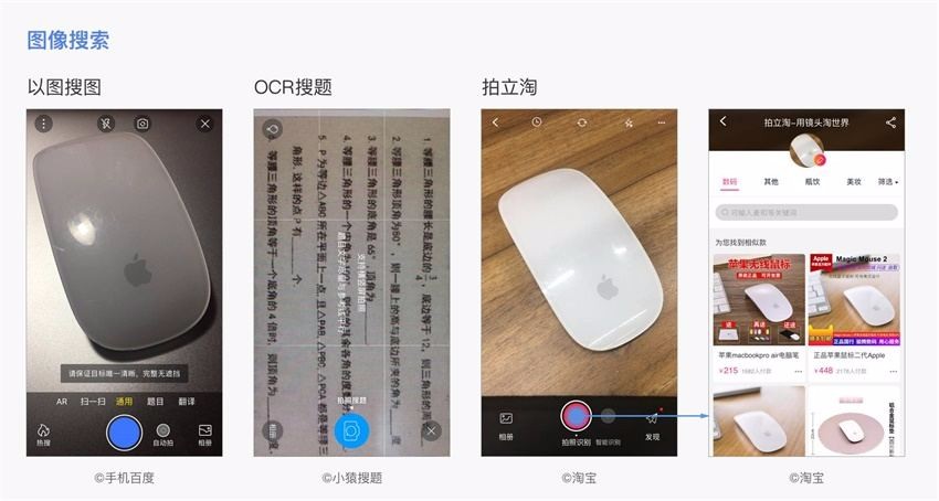 借助图像识别技术,图像搜索也得到了广泛应用。百度的「以图搜图」,可以搜索相似图片、追踪图片来源、获取不同尺寸的图片;小猿搜题的「拍照搜题」,利用OCR技术,进行快速识别,省去了输入的繁琐过程;淘宝等电商的「拍立淘」,一方面可以搜同款商品,一方面在无法准确描述商品名称的时候,也能进行搜索。
