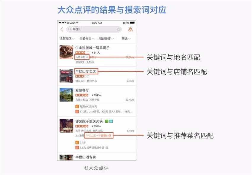 大众点评做了一个很好的示例:我们搜索「牛栏山」(“牛栏山”是一个地名,同时也是酒的品牌)。大众点评搜索内容包括店铺名、地点和推荐菜,那么可能会有3种搜索结果: