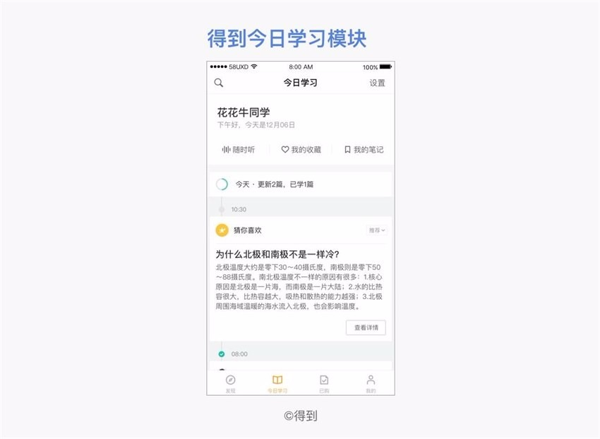 比如得到的今日学习模块,以feed流的形式,展示用户每天的学习任务。这个模块预设功能是浏览、收听,且内容有限(只包括用户付费订阅的内容和平台为该用户个性化推荐的内容),搜索在此仅仅是辅助功能,所以将入口弱化。并且得到将此处搜索设定为全局搜索(搜索全App),可以引导用户发现更多内容,避免出现无结果/少结果的情况。
