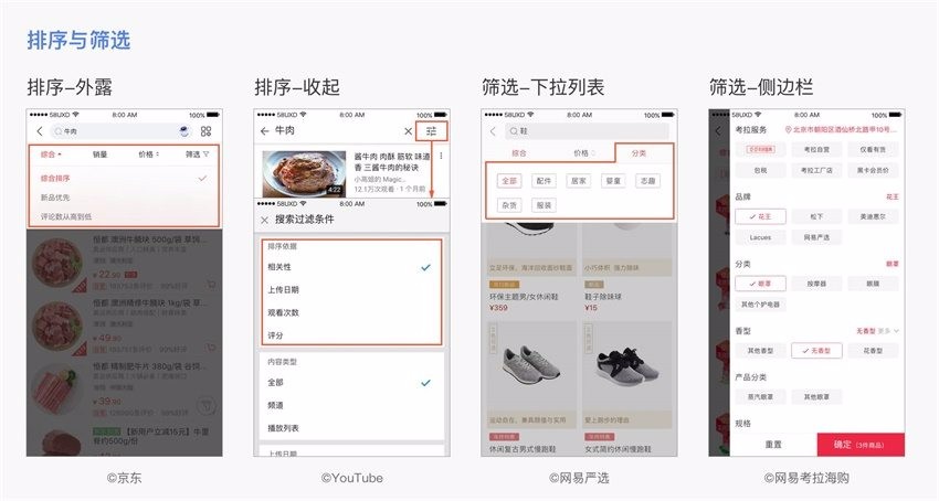 一般排序功能会放在搜索栏与结果之间,便于切换。但有些App(主要是国外App,如亚马逊、YouTube),将排序功能收起,操作便利性不如前者。