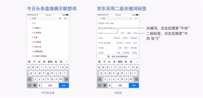 △ 今日头条直接展示联想词、京东采用二级关键词标签