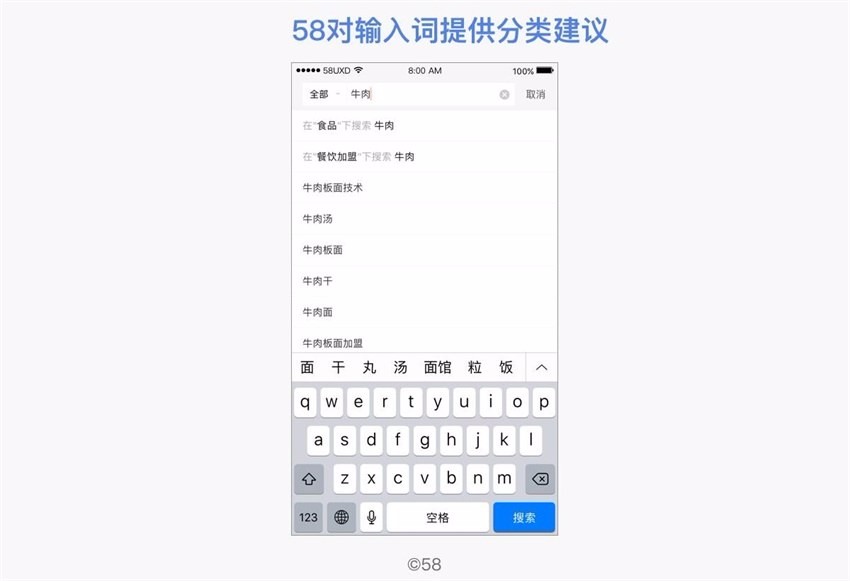 除了提供关键词,还可以对输入词进行判断,适时提供分类建议(如58、京东、亚马逊、闲鱼等,可参考前文「J.分类搜索」一节)。58作为一个综合的生活服务平台,业务类别多,搜索「牛肉」,在很多类别都有相关信息,选取「食品」和「招商加盟」这两个可能性最大的类别推荐给用户。