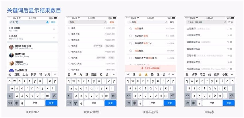 还可以将关键词对应的搜索结果数量前置,便于用户控制搜索词的颗粒度,也避免出现无结果或者少结果的情况。代表有Twitter、大众点评、喜马拉雅、链家、百度外卖等。