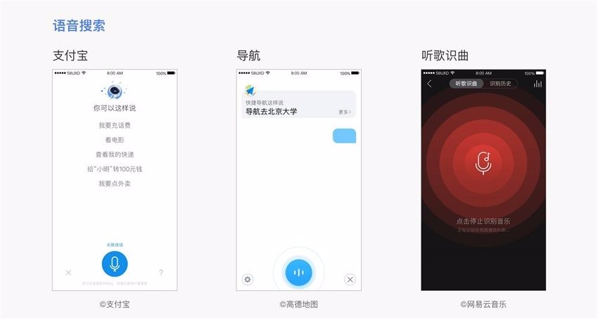 比如语音搜索,不但为视力不佳的老年人提供了一种友善的方式,也适用于一些输入不便的移动场景。比如导航类内置语音搜索,可以在驾车途中实现路况查询、地点搜索、路线规划等功能。另外在一些音乐类App中,可以带入音律,实现「听歌识曲」,甚至是「哼唱识曲」。