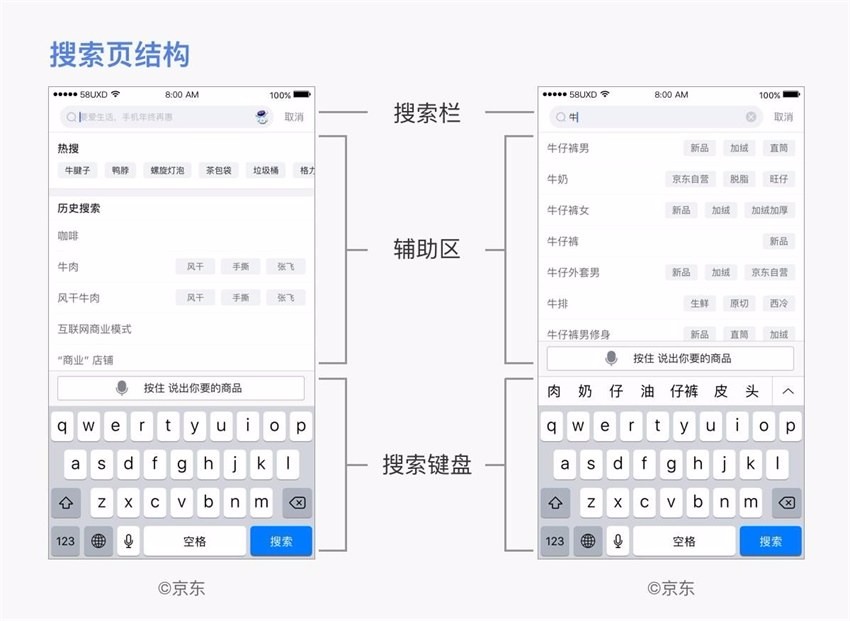 搜索页包括两部分,搜索栏和辅助区(搜索栏以外的部分)。进入搜索页后,一般默认调起搜索键盘。