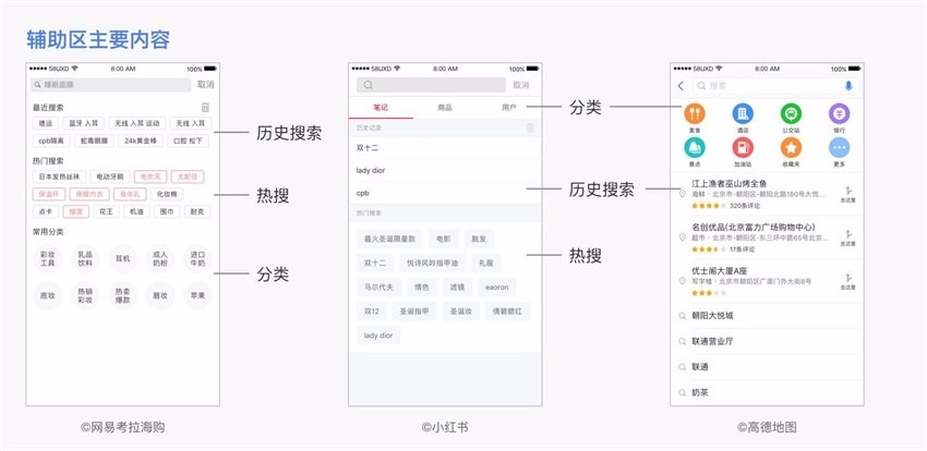 辅助区主要为用户提供合适的推荐,以提高搜索效率。此外,也兼具运营属性,可以作为推广入口。