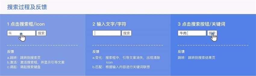 搜索过程又可拆解为三个动作:点击搜索框/icon → 输入文字/字符 → 点击搜索按钮/关键词。每个动作触发后,都会有相应反馈。