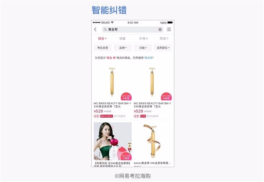 智能纠错:当用户输入了错误的词,可能搜索不到结果。需要系统判断识别,推荐正确的词,或者直接将正确结果展示出来。