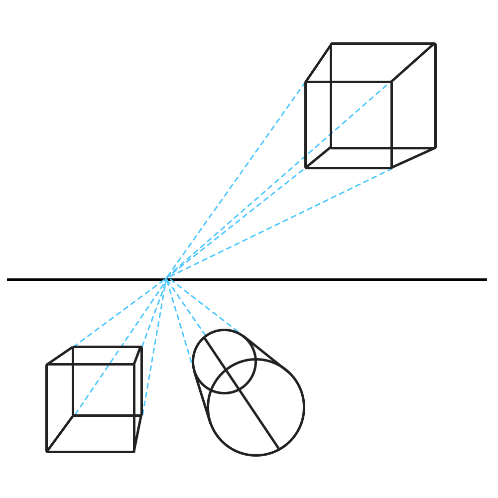 一点透视:透视来源于一个点,形状的变化与该点的距离相关。一点透视可以理解为在一个空间内多个物体产生的近大远小的关系。