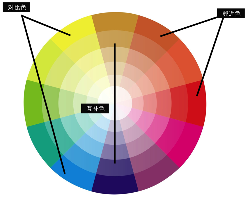 邻近色:相互接近的颜色在色环上的距离相距90度,或者相隔五六个数位的两色。色相相近。冷暖性质相近,传递的情感也较为相似。例如红色、黄色和橙色就是一组临近色。邻近色表现的情感多为温和稳定,没有太大的视觉冲击。