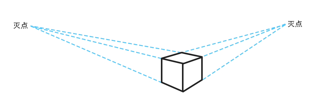 两点透视:通过两个灭点建立透视。就像我们站在一个比较庞大物体的面前,这个物体的两侧都会产生近大远小的关系。把近大远小的线延伸,它们会相较于视平线上的两个灭点。这就叫两点透视了。