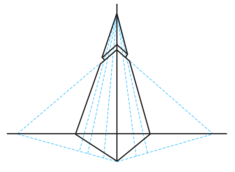 三点透视:通过两个灭点和延长线进行辅助。一个高于观察者的物体除了产生两点透视之外也会在其顶部产生另一个灭点,三个灭点都存在,我们称之为三点透视。