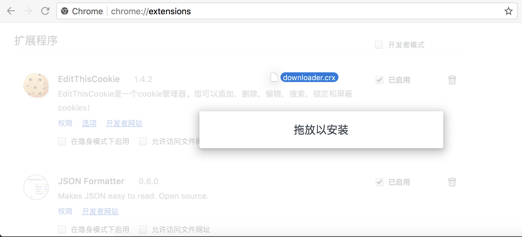 把下载好的“新版谷歌浏览器插件.crx”从文件夹里直接拖到“扩展程序”界面中。