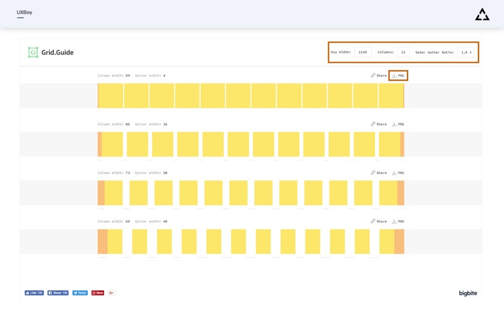 GridGuide 最大优点是可以针对一种栅格系统生成4组不同水槽宽度的栅格化方案,能比较直观的比较不同水槽宽度下各个栅格系统的视觉感受。使用方法:在右上角设置好页面宽度以及栏目数量,页面内就会自动生成可以下载为 png 图片的栅格。