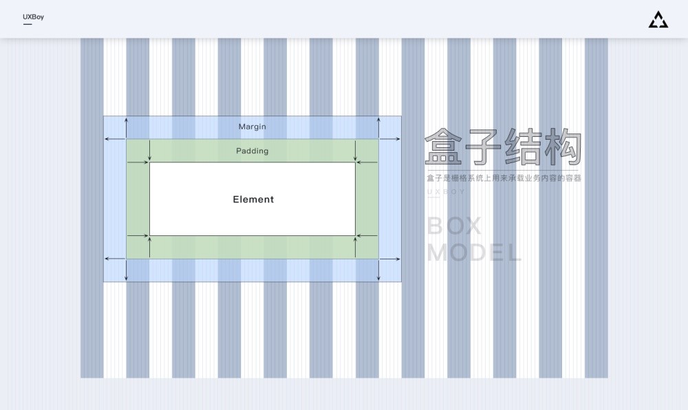 在栅格系统上容纳业务内容的容器我们把它称之为盒子(Box),栅格系统上的盒子其实跟前端工程师写页面时用到的盒子是一致的。如图所示,当我们浏览任何一个网页时,右键>检查元素(审查元素),然后在 style 菜单下就可以看到这个盒子结构了。其中 Padding 就是主体内容(Element)距离盒子外侧的距离,我把它称之为内边距,(Element 可以是一个按钮,一段文本、一张图片或者一个表格等)而 Margin 就是相邻两个盒子间的距离,对应在后台栅格系统中其实就是水槽的大小。了解完栅格系统的盒子模型之后,下一步我们需要根据具体业务内容来确定盒子的宽度,也就是如何利用栅格系统做实际内容的布局与版式设计。
