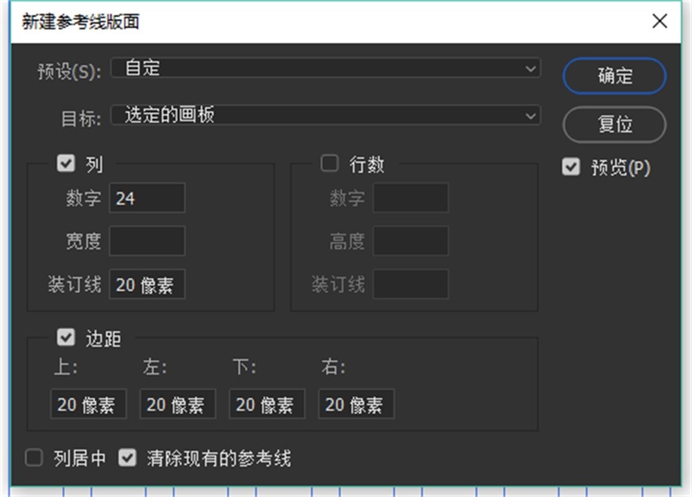 Ps 有个功能叫做「新建参考线版面」,打开这个面板后,在预设这里可以看到 Ps 已经预设了8列、12列、16列、24列的栅格系统,选择对应列数就可以看到页面上参考线的变化。预设中「装订线」的宽度即栅格系统中水槽的宽度。默认均为20px,我们可以根据之前讨论的8的倍数原则,将其手动更改为24。