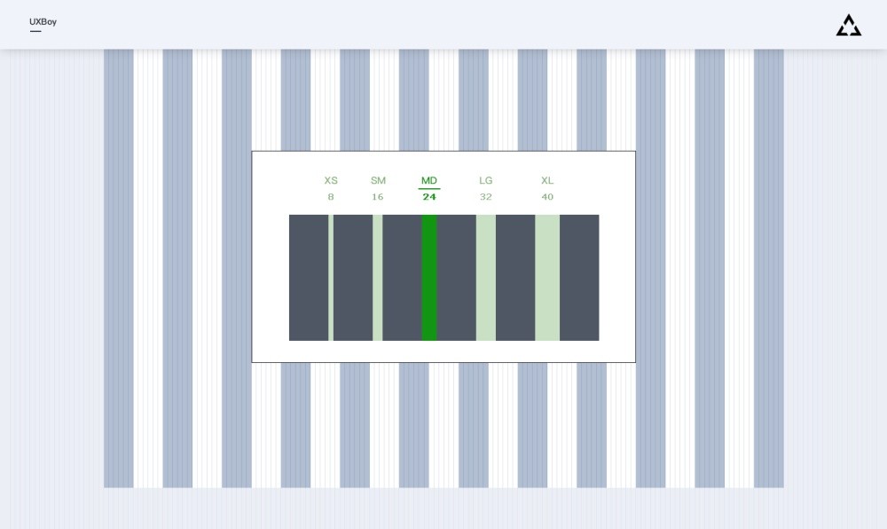 水槽的宽度是8n,也就是水槽可以以8为基本单位去增加或减小。为了减少设计决策成本,我们会事先设定好一系列水槽宽度,并定义好每个宽度对应的使用场景,然后根据每个场景使用对应数值就可以了。我定义了一组水槽的值是8、16、 24、32 、40,为了区分它们的使用场景我们依次为其命名为 XS、SM、MD、LG、XL。根据实践经验,正常情况下,两个盒子间距(水槽)的值为24(MD)时,视觉上是最为舒适。
