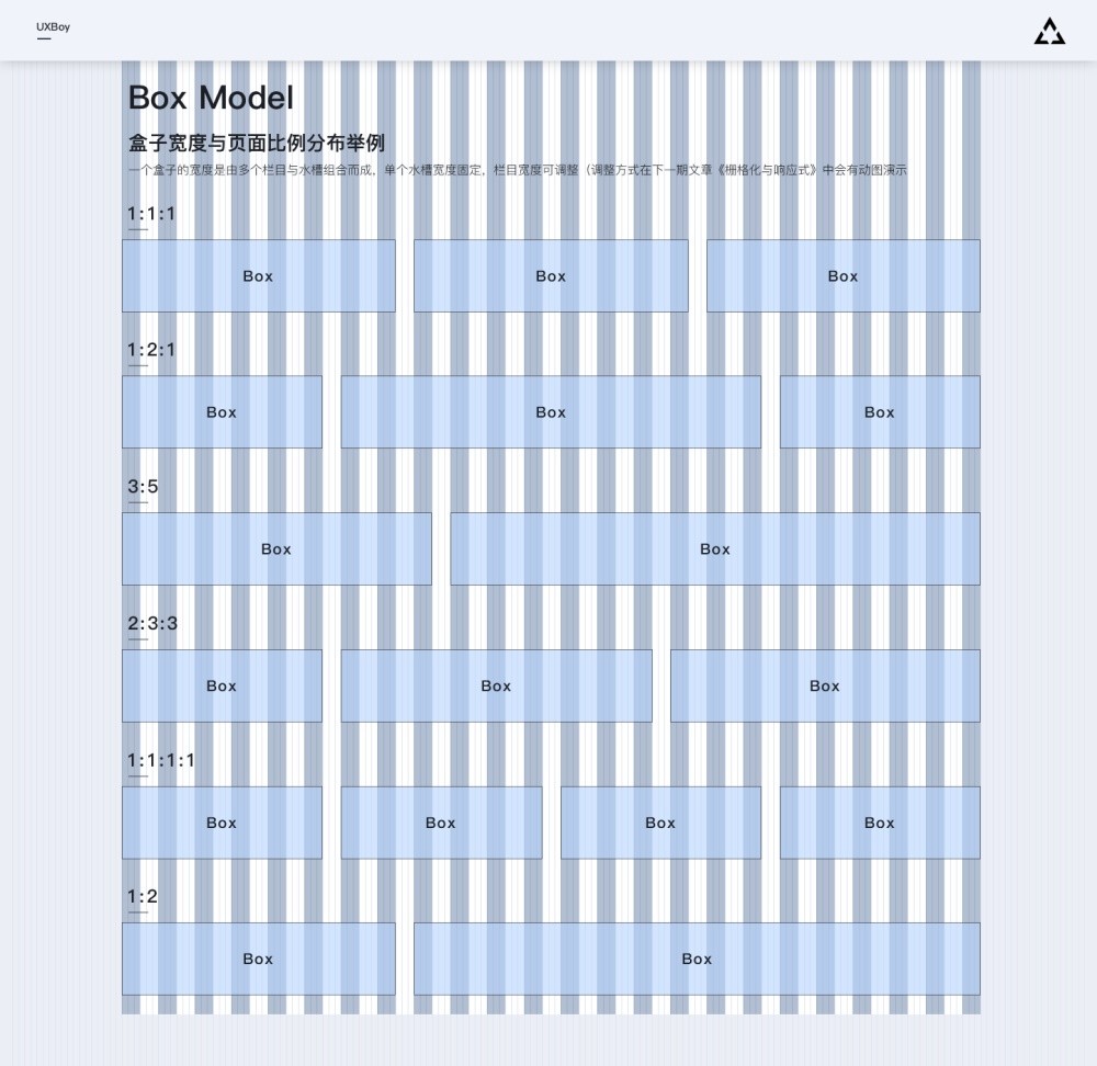 以24栅格系统为例,一个24栅格系统可以根据业务需要被2等分、3等分、4等分、6等分、8等分、12等分,还可以被1:1:1、1:2:1、1:3:2、2:3:3、1:2、1:3、1:5、3:5等不对称分割,具体采用哪种比例的组合需要我们根据自己业务需求来定,我们此处所说的比例实际上就是盒子的宽度。