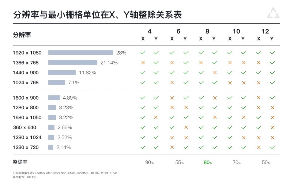 我们选取4、6、8、10、12为栅格的候选原子单位,然后用目前主流屏幕分辨率与其相除,判断各个分辨率在竖直(Y)与水平(X)方向能否被候选原子整除,统计结果如图。