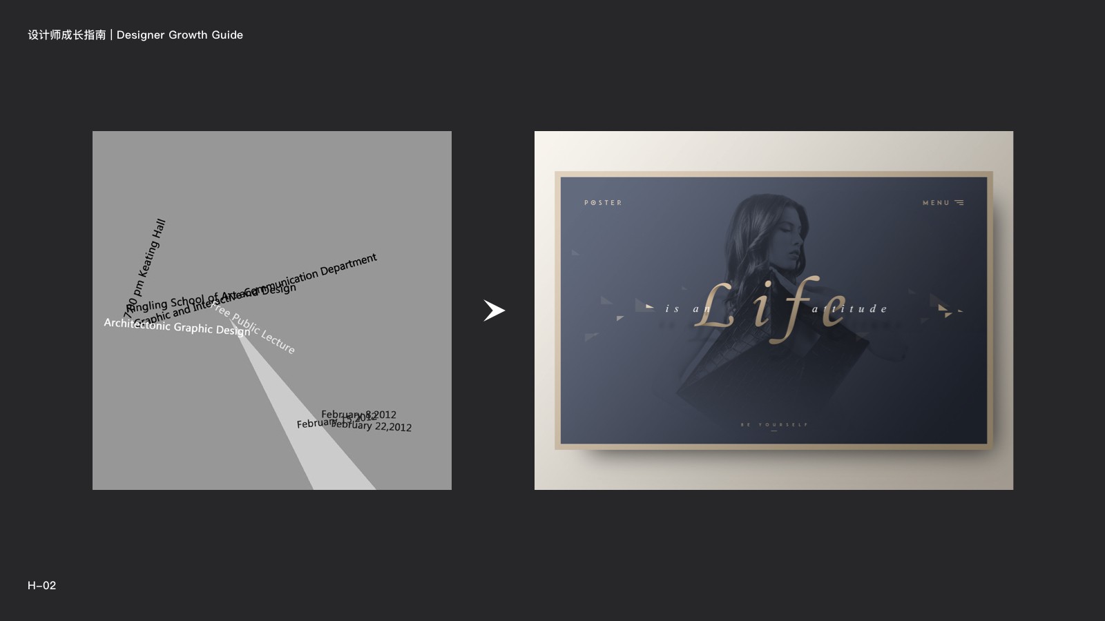 前面讲到,多看、多收集、多练。而看和练的过程,则需要你去好好研究和品味。这些作品运用了哪些技法?运用了哪些平面的基础原理?比如点线面原理、对比、排列、节奏感、呼吸感等。你要学的,就是这些知识点在具体案例中的运用方式。