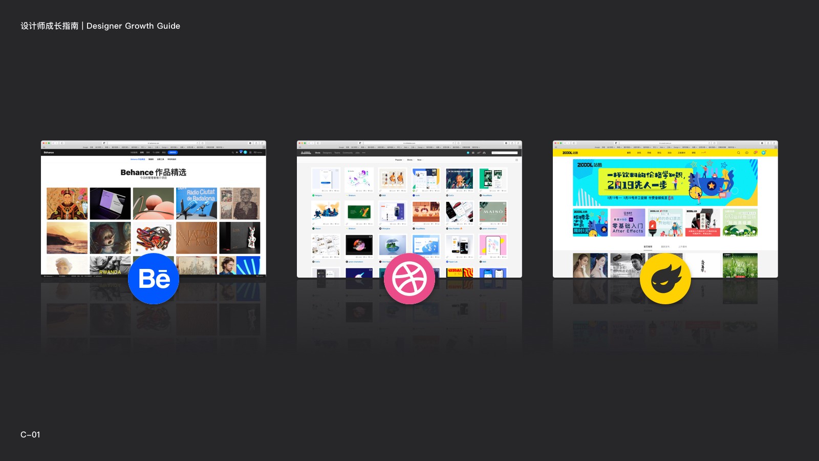 Behance、Dribbble、Zcool上面有大把顶尖的设计作品,这么宝贵的财富应该懂得去利用。Behance侧重于全球设计界完整性优秀项目,除了学习作品本身外,你还可以学习作品的整体阐述思路,展现方式等。Dribbble侧重于UI类的最新趋势风格,你可以学习最前沿的设计趋势和风格。站酷就不用说了,除了作品以外,还有各类的优秀文章,最重要的是还可以与许多优秀的设计师进行交流学习。