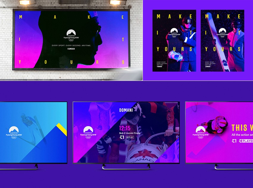 Eurosport's 2018 Pyeong Chang olympic broadcast also applied strong color gradient to all the application designs including logos, graphics and photography. Especially, the contrast of fluorescent graphic and the dark background emphasis the atmosphere of winter sports.