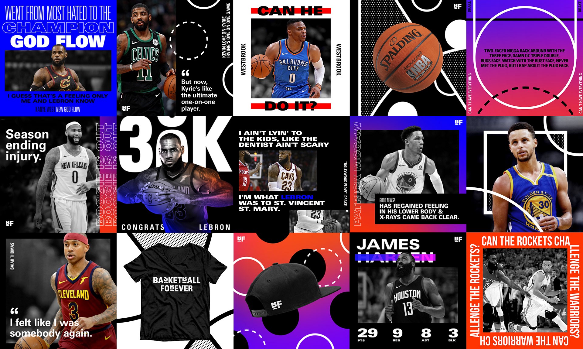 NBA新闻广播公司品牌重塑项目所使用的,诸如彩色渐变和大胆排版的设计方法,也反映了最新的趋势。他们创作了一个系统,通过各种颜色,字体和布局的应用,可以产生各种图形输出。