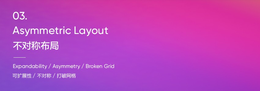 与过去基于固定网格系统的布局相比,最近越来越趋于使用仅显示图像一部分的非对称布局。虽然好像只显示整个图像的一部分,设计师却可以在大系统中无限延展每个图形。你可以认为平衡被打破了,设计师却可以更加自由地应用图形元素,呈现更强烈的视觉印象,还可以有很酷的图形组成。