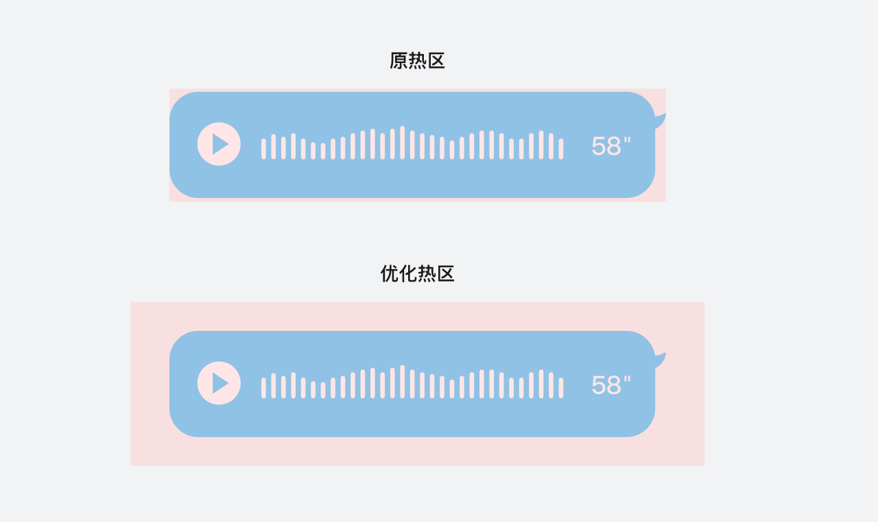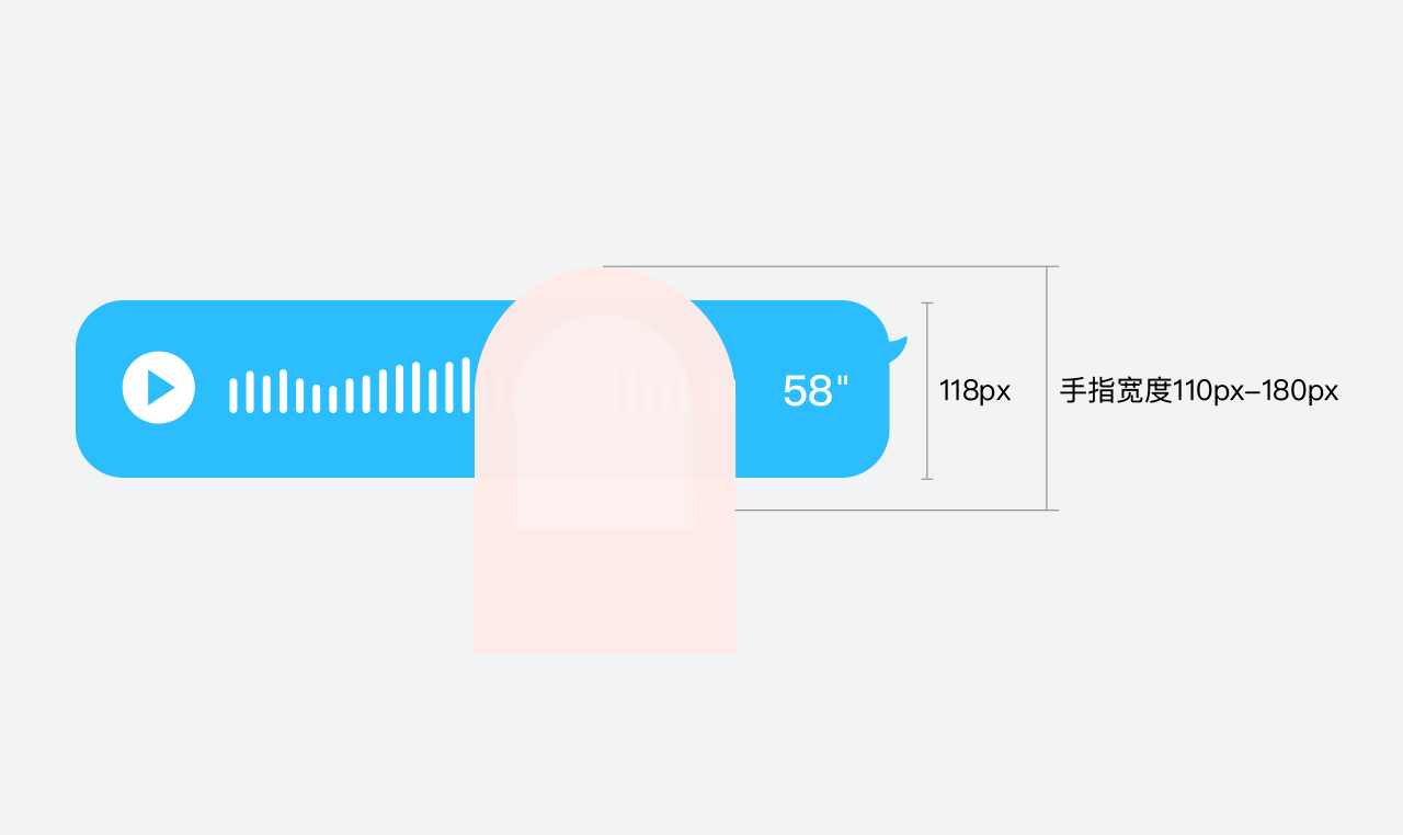 畅快意味着无拘无束,翻译成交互语言就是要赋予用户更大的操作区域。但是我们的手指宽度和控件大小有时难以匹配。例如,8.0UI改版后的语音气泡高度为118px,而成人手指的宽度范围则在110px-180px。如果拖拽只能在气泡范围内进行,就意味着用户需小心翼翼地去操作。为了实现“无拘无束”的拖拽体验,我们根据用户的行为阶段对响应范围进行了两次放大。