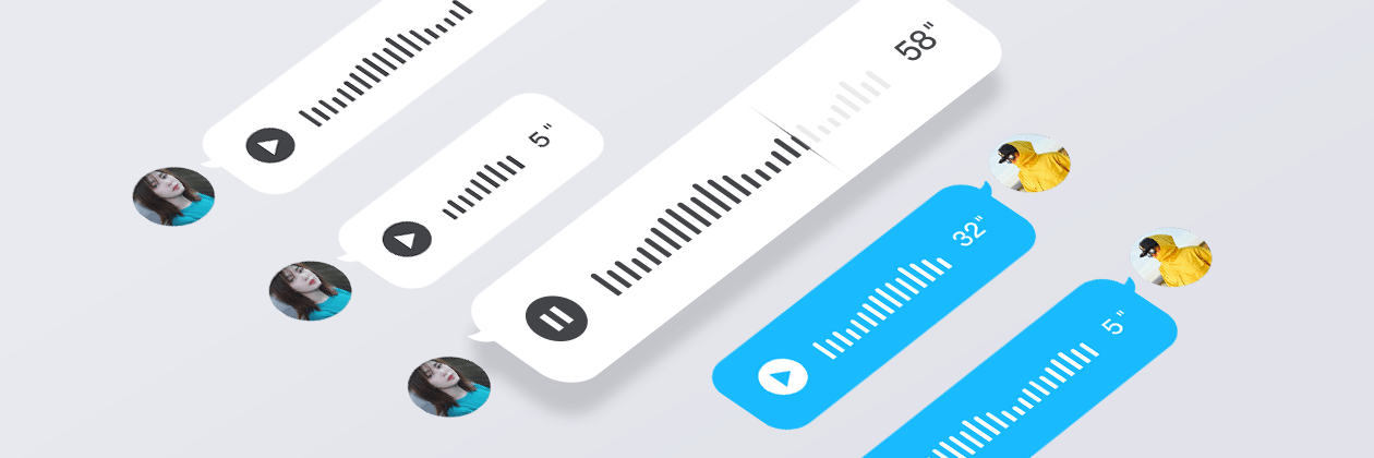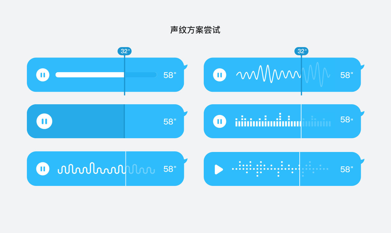 但是这些元素的加入无疑会加重气泡内的信息负担。并且当同时出现多个语音气泡时,我们更加需要保证聊天页面有适当的信息密度。因此在声纹样式设计中,降噪成为了关键。在发散了多种样式后,我们最终选择了这种简约的声纹形态。它既能很好的展示进度信息,又可以平衡气泡内的信息密度,让QQ多样化的用户群都能对语音进度拖拽有更直觉化的操作。