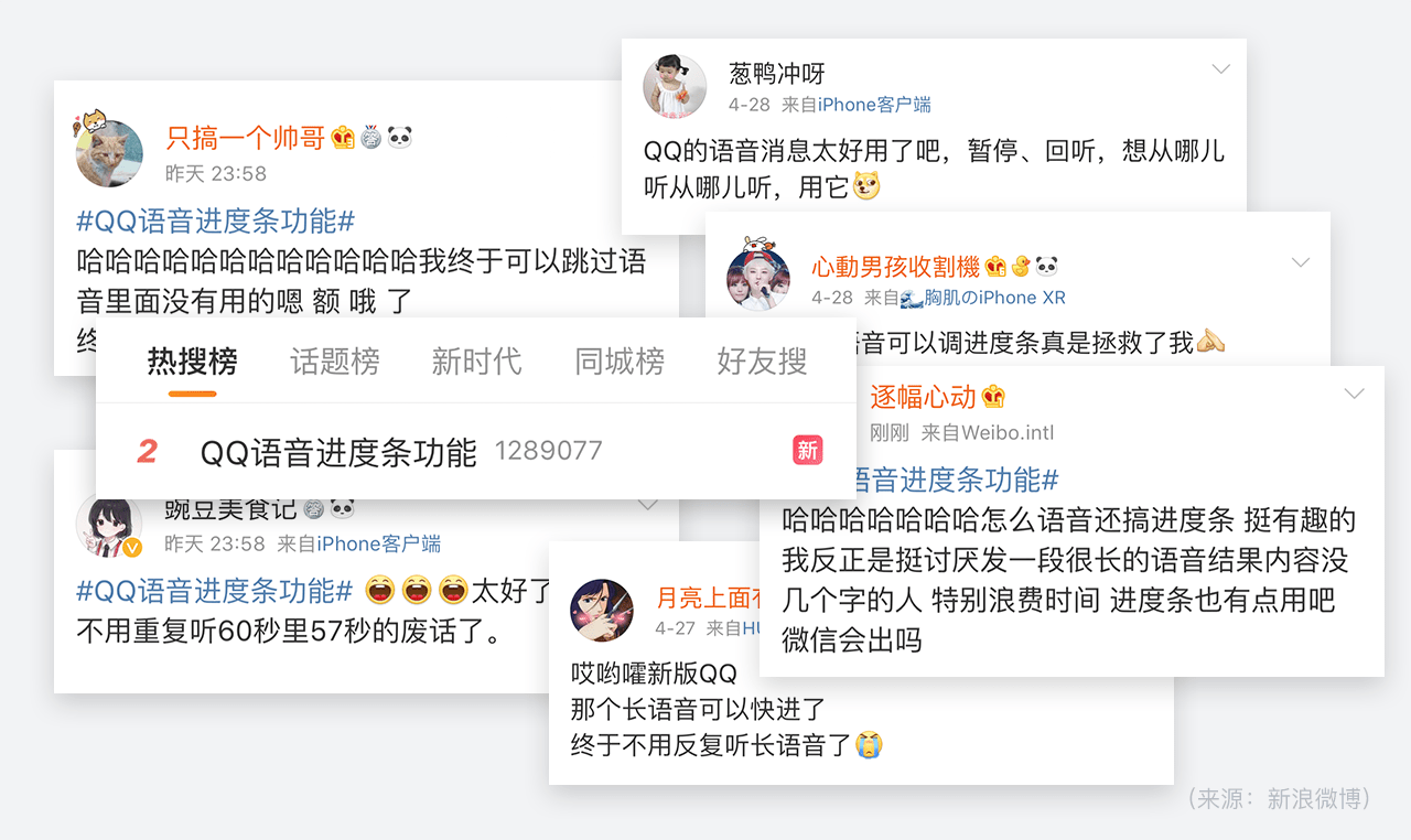 QQ新版语音气泡iOS上线当天喜提微博热搜。看到用户们的花式夸奖,我们的心情美滋滋。但同时网络上也出现了一些负面的评价,这些声音也在鞭策设计团队持续打磨语音消息体验。