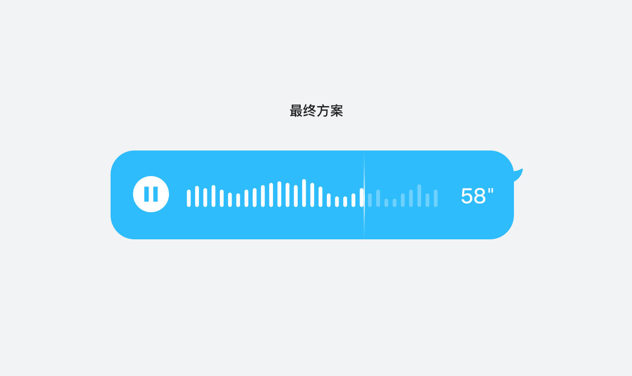 暂停和拖动在语音中不常见,但它却是播放器的通用功能。在播放器设计中,有三个用户行为引导的关键元素:a.按钮—播放和暂停的指示 b.游标—拖动指示 c.颜色—进度指示。本次语音气泡的设计中,我们依旧沿用了按钮、游标、色彩作为指示性元素。