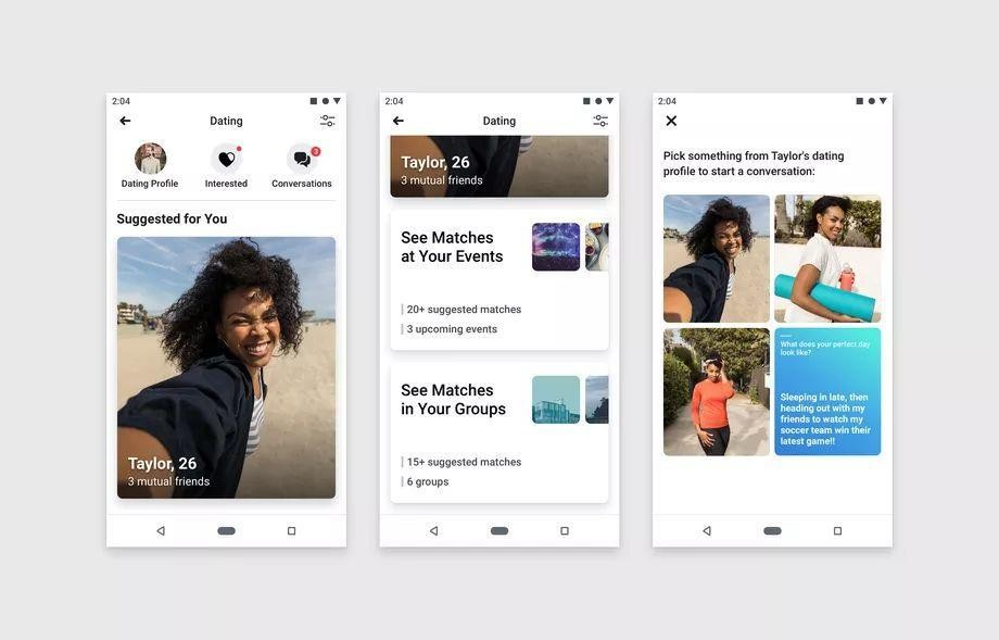 以 Groups Tab 为例,它会在现有基础上,帮助用户更快匹配上符合自己兴趣爱好的圈子;Meet New Friends 功能,则专注帮助用户开拓新的圈子;Facebook Dating 则是聚焦于恋爱和亲密关系的运营。值得注意的是,Facebook 非常贴心地将 Facebook Dating 中用户所使用的帐号将会和自己的主帐号保持独立的关系,恋爱相关的信息可以只对部分用户可见,私密性和可控性更强。而涉及到恋爱匹配的 Secret Crush 也是类似,只有当双方在各方面都「呼应上了」之后,才会被告知匹配成功。